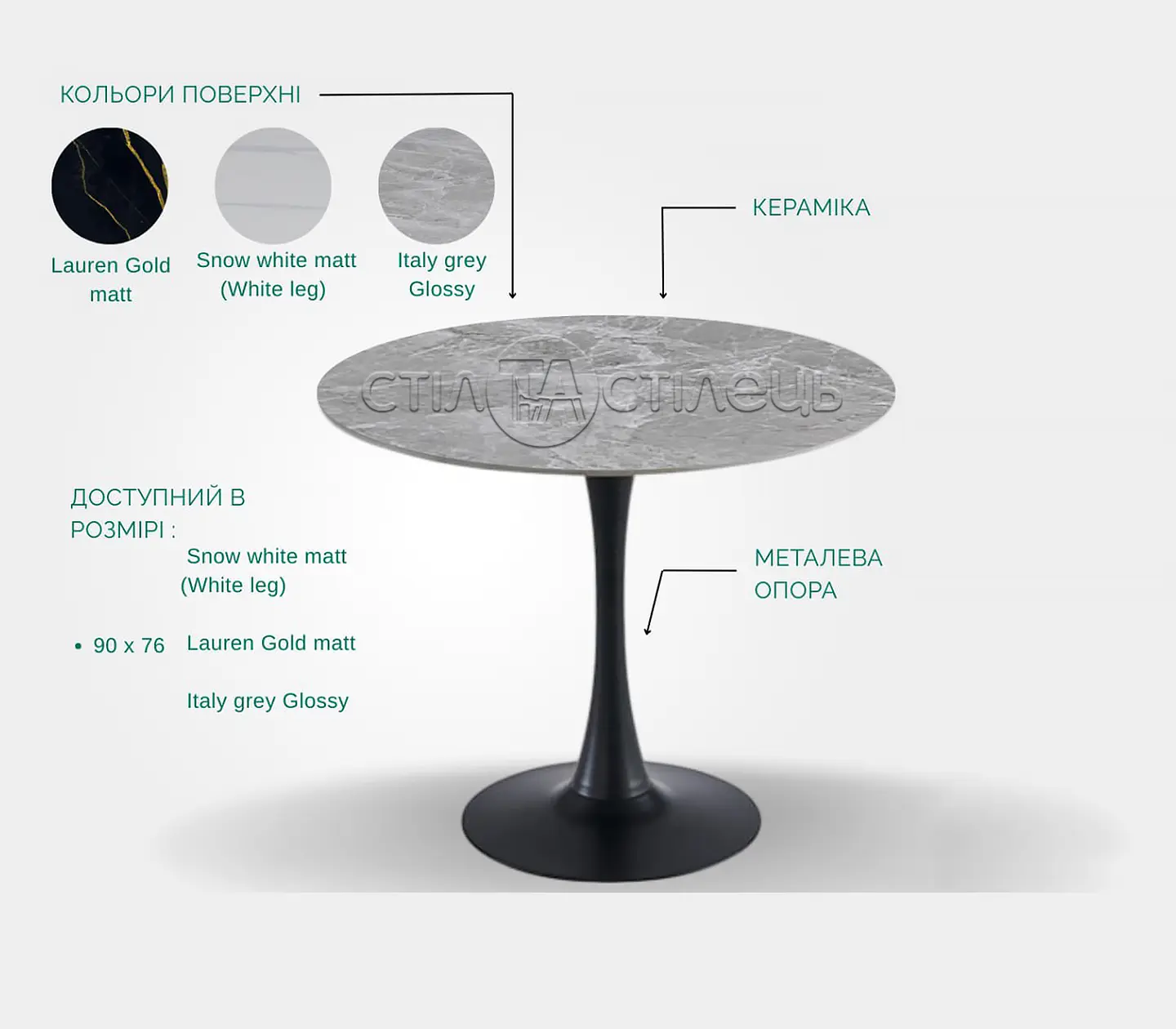 - Завдяки компактним розмірам (діаметр 90 см), стіл керамічний Опал чудово підходить для невеликих приміщень, не займаючи багато місця, але забезпечуючи достатньо простору для комфортного розміщення 2-4 осіб. Стіл є ідеальним варіантом для невеликих кухонь, їдалень або кавових зон.