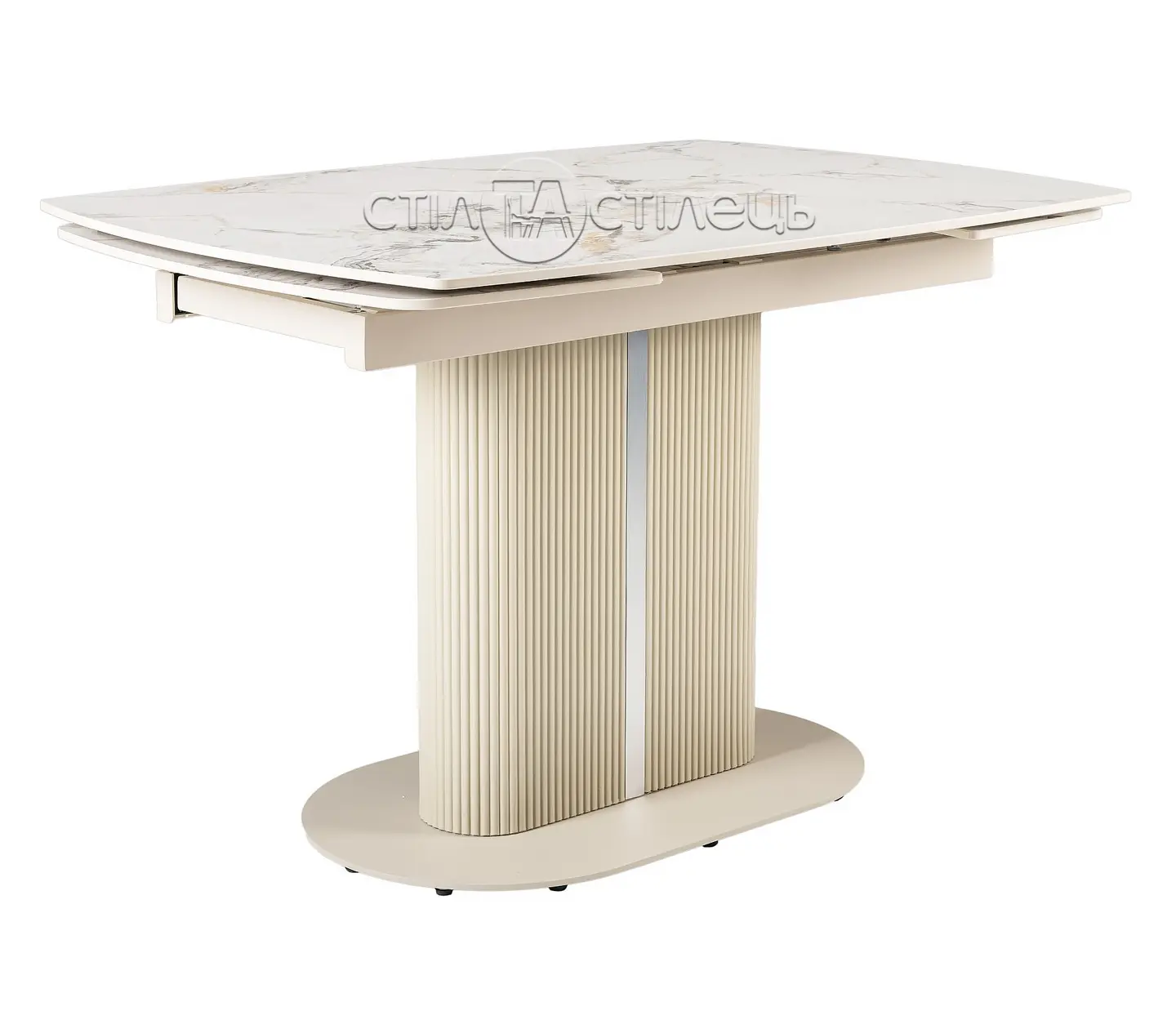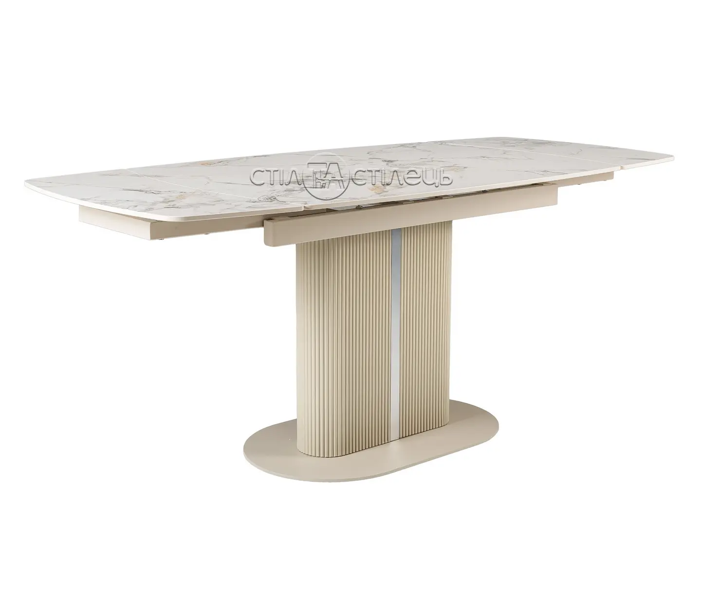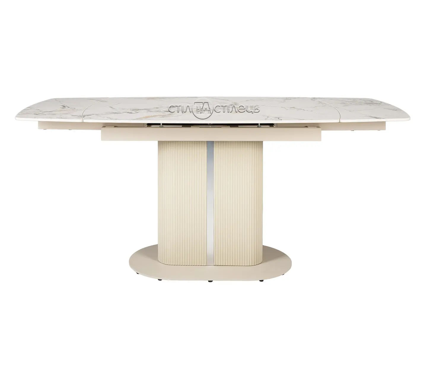 • Модель керамічного столу Комо виконана на металевому каркасі з МДФ в оригінальному дизайні. Столешня з глянцевої кераміки нагадує витончені прожилки мармуру, що грають світлом і підкреслюють глибину природного візерунка. Теплий відтінок створює враження благородного каменю, а гладенька поверхня легко очищується та стійка до перепадів температур..
